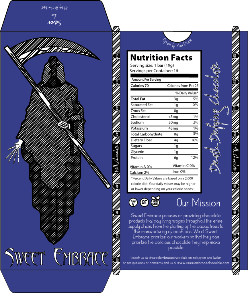 Packaging project using preexisting chocolate bar dimensions and a palette of only black, white, and one of the three primary colors at full saturation. This project inspired my logo creation.